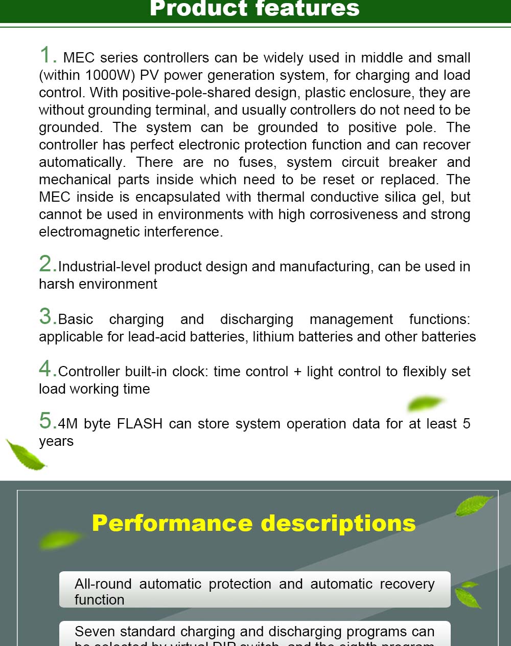 | MEC series controllers can be widely used in middle and small (within 1000W) PV power generation system, for charging and load control. With positive-pole-shared design, plastic enclosure, they are without grounding terminal, and usually controllers do not need to be grounded. The system can be grounded to positive pole. The controller has perfect electronic protection function and can recover automatically. There are no fuses, system circuit breaker and mechanical parts inside which need to be reset or replaced. The MEC inside is encapsulated with thermal conductive silica gel, but cannot be used in environments with high corrosiveness and strong electromagnetic interference.